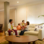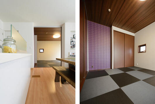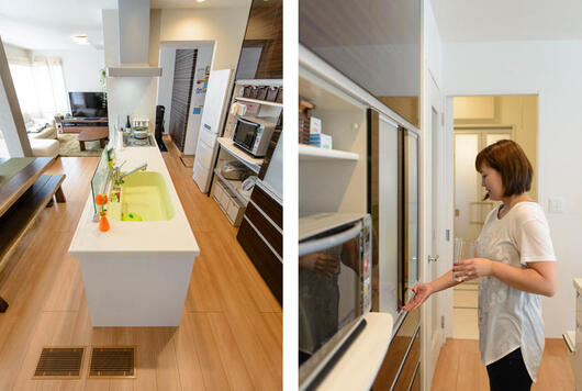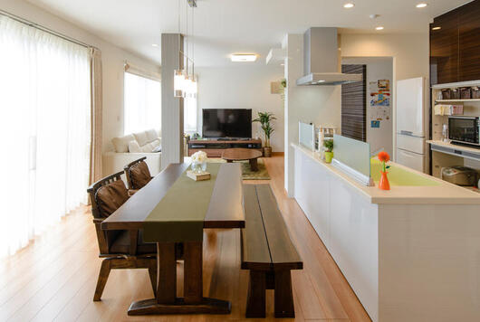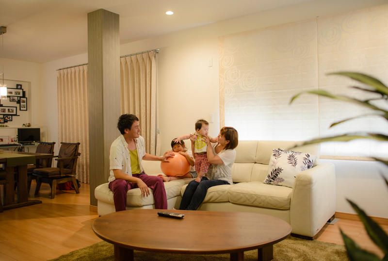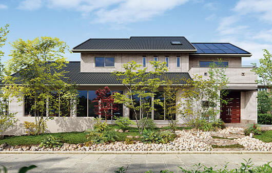 分譲地の周辺環境や土地の気候など、移住者への助言はパーフェクトだったと家づくりを振り返ります。大きな窓から緑を眺められる新居は、ライフサイクルコストを意識して大容量の太陽光発電とタイル外壁を採用。間取りも将来のご両親との同居や子供の成長を見越して考えました。