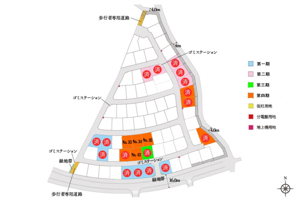 - ※本分譲地では、快適で良好な住環境を皆様に提供する為に地区計画・景観協定を設けております。 ※先着順分譲のため、お申込み済の場合がございます。あらかじめご了承ください。 ※各宅地の販売対象面積は分割手続き後の面積となるため、若干の誤差を生じる恐れがありますが、誤差が1㎡未満の場合は精算致しません。 ※No.34:2025年12月13日以降のご契約、No.33・35・43:2025年12月27日以降のご契約については、補助金等が受けられない場合があります。詳細は営業担当にお問い合わせください。