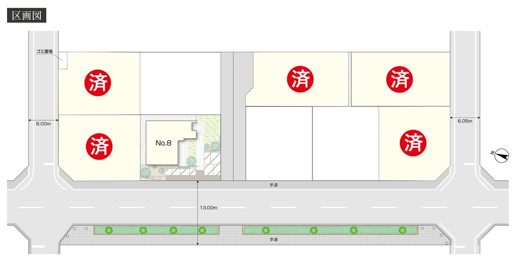 - 北側・南側各6.0m、西側13.0m公道(アスファルト舗装)
