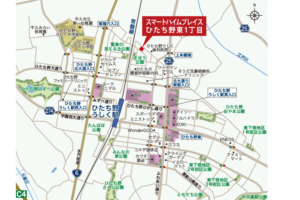 - JR常磐線「ひたち野うしく」駅まで徒歩11分(約810m)
