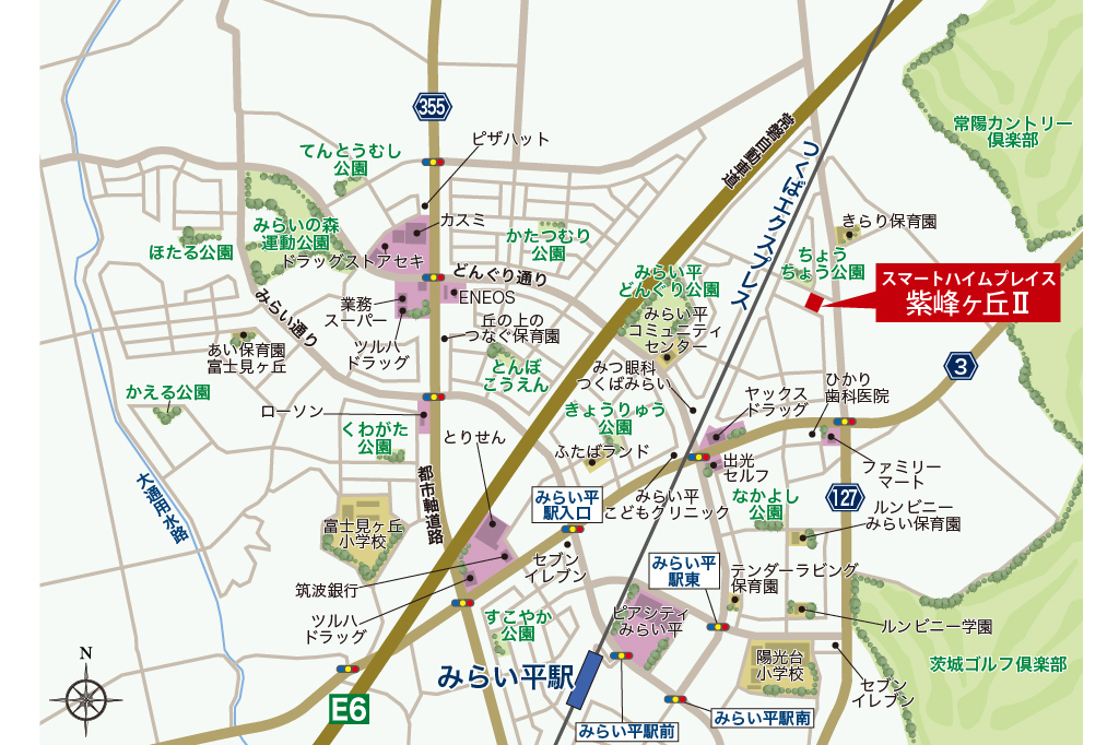 - 徒歩4分~5分の「紫峰ヶ丘5丁目」バス停からバス12分でつくばエクスプレス「みらい平」駅