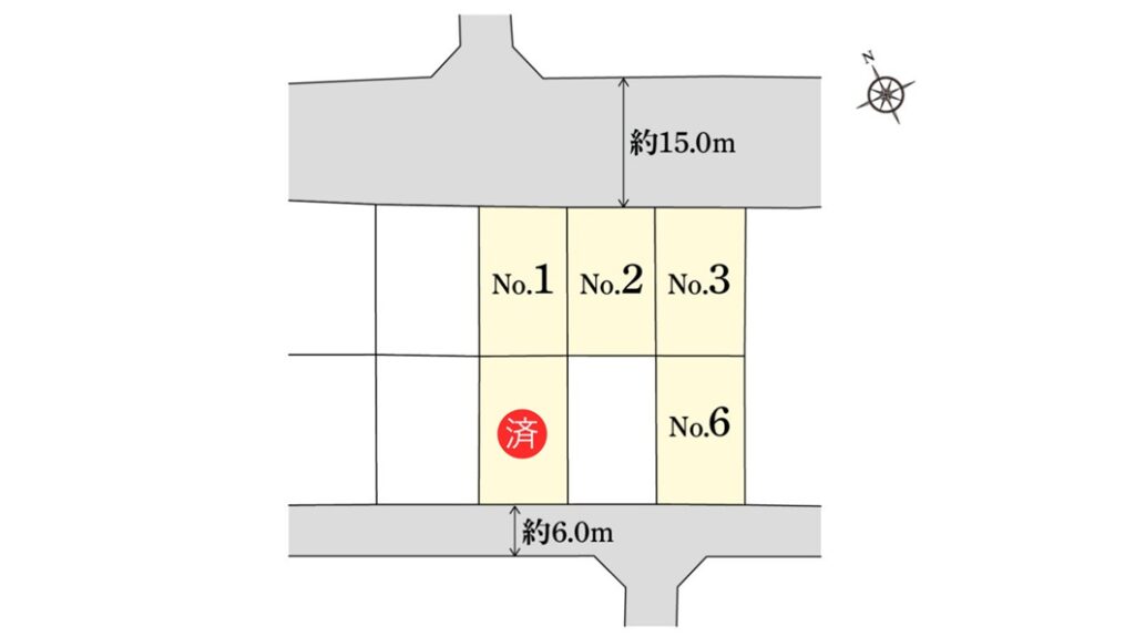 南西側6.0m、北東側15.0m公道(アスファルト舗装)