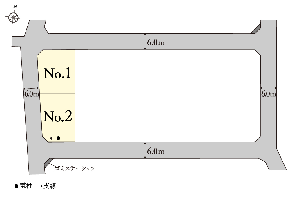 - 北側・西側・南側6m公道(アスファルト舗装)