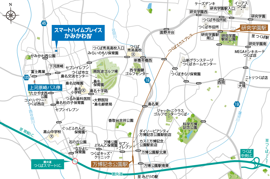 - 徒歩18分~19分の「鬼ケ窪南」バス停からバス13分でつくばエクスプレス「万博記念公園」駅