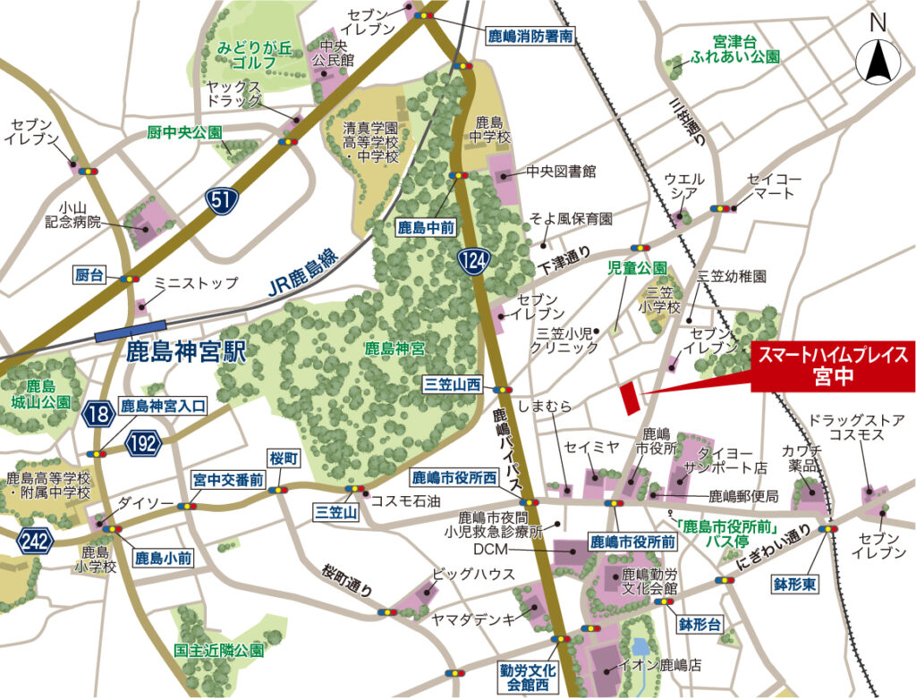 - 徒歩10分の「鹿嶋市役所前」バス停からバス14分でJR鹿島線「鹿島神宮」駅