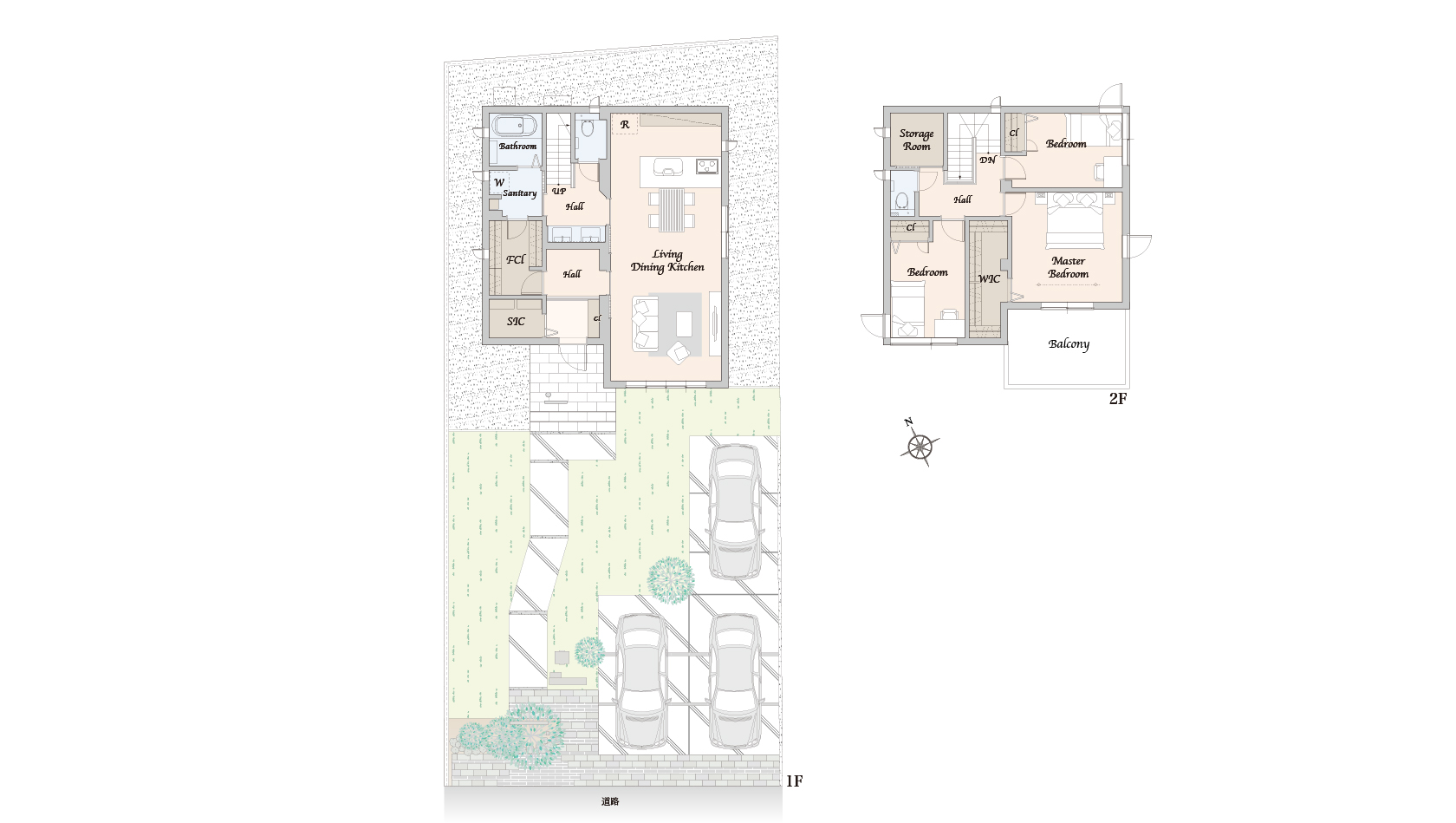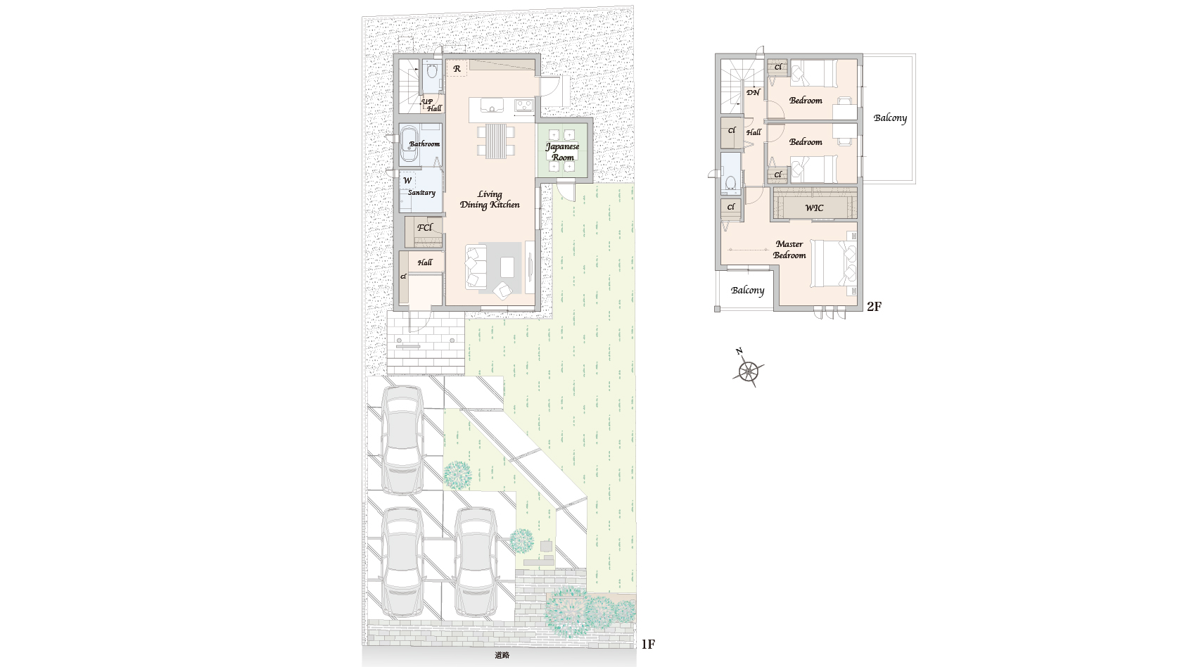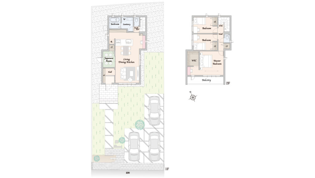 2階の全居室にはバルコニーがあるので、晴れた日には温かな陽光が室内まで届きそうです。駐車場は車が3台駐められる広さを確保。