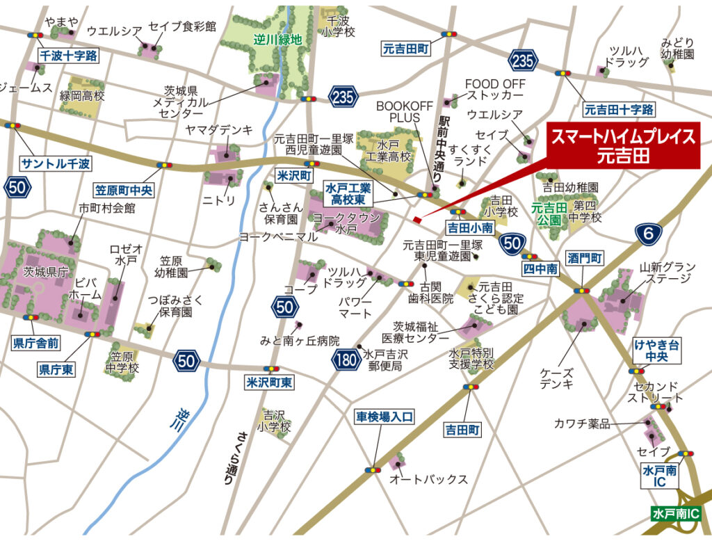 - 徒歩8分~9分の「工業高校前」バス停からバス15分でJR常磐線「水戸」駅