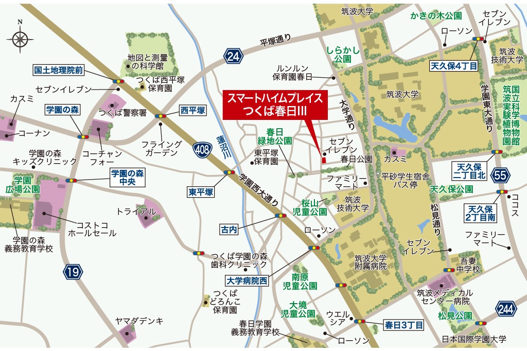 - 徒歩8分の「平砂学生宿舎前」バス停からバス9分でつくばエクスプレス「つくば」駅