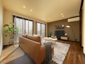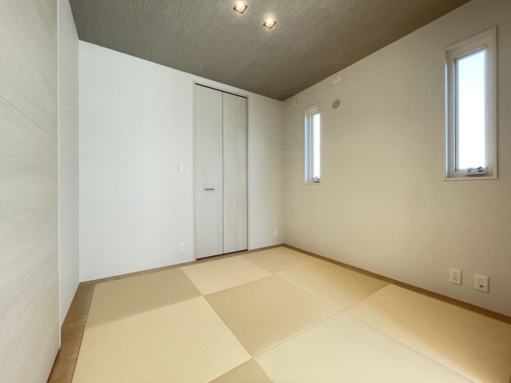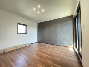 家族が集うリビングは、2連の窓から注ぐ陽光で開放的な空間になっております。また、リビング脇には使い勝手の良い大容量納戸を備えております。