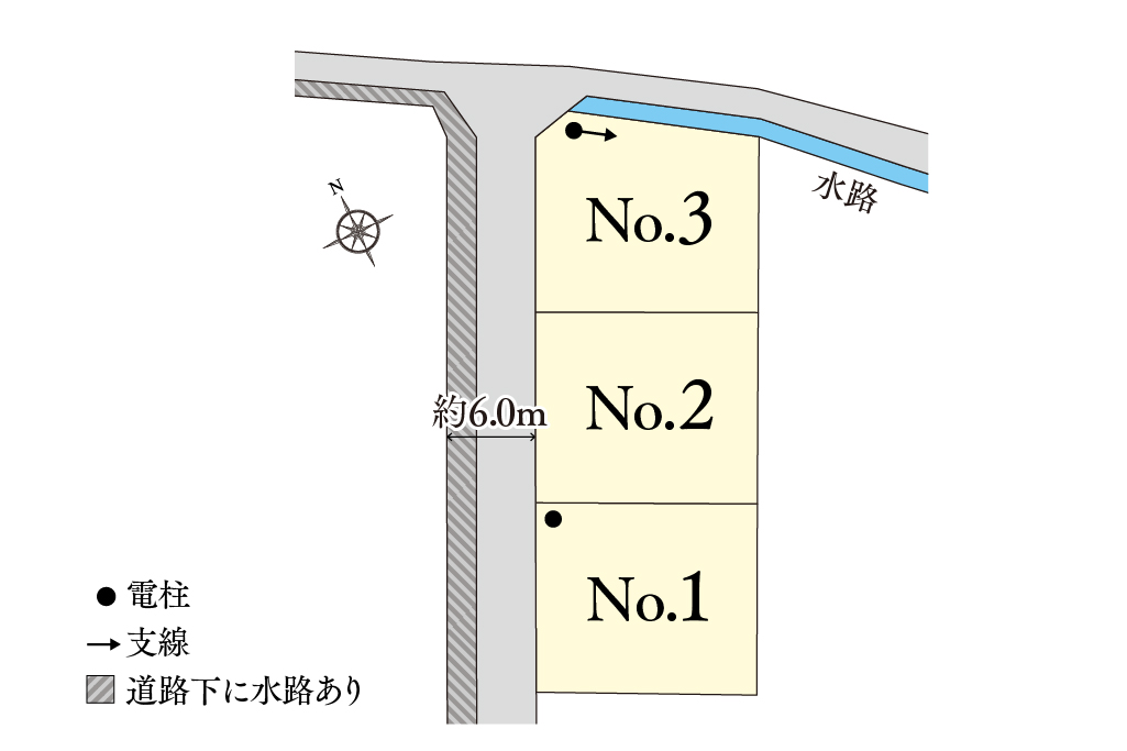 - 西側6.0m、北側3.0m公道(アスファルト舗装)