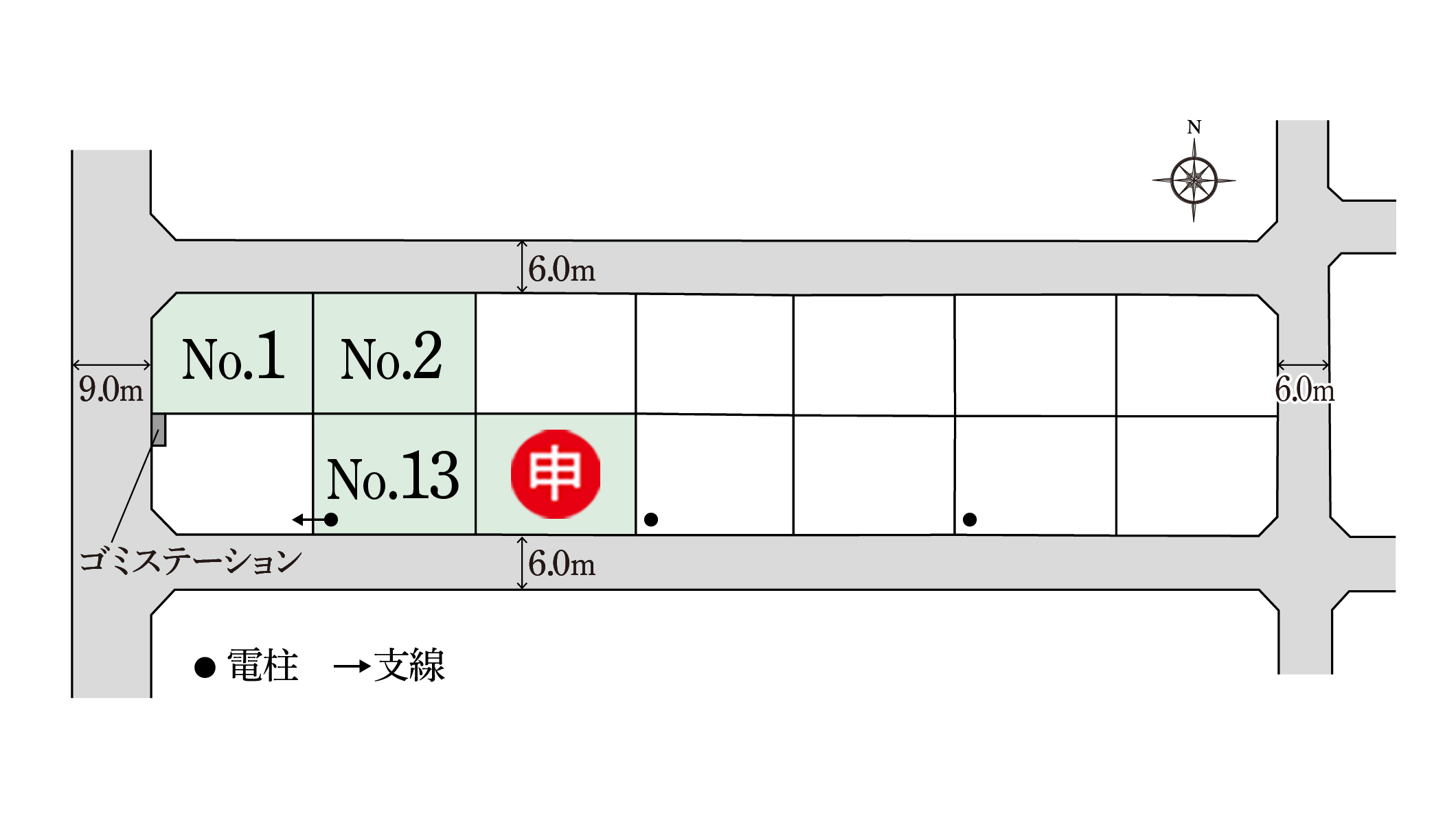 北側・南側6.0m、西側9.0m公道(アスファルト舗装)