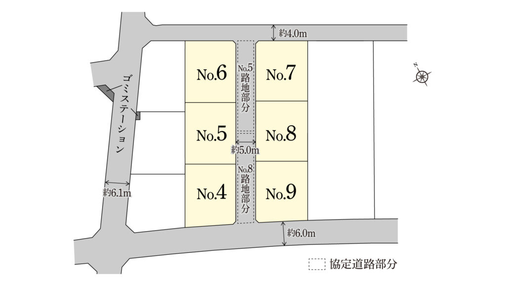 ※共有地に関する協定書の締結あり、地役権設定あり(路上部分:協定道路部分/No.5:115.01m²、No.8:115.00m²を協定道路として提供)