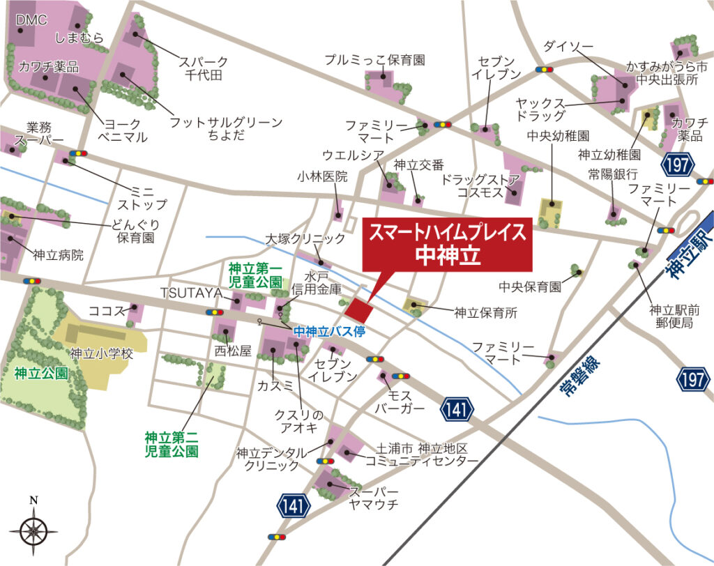 - 徒歩3分~4分の「中神立」バス停よりバス8分でJR常磐線「神立」駅(約1080m~1130m)