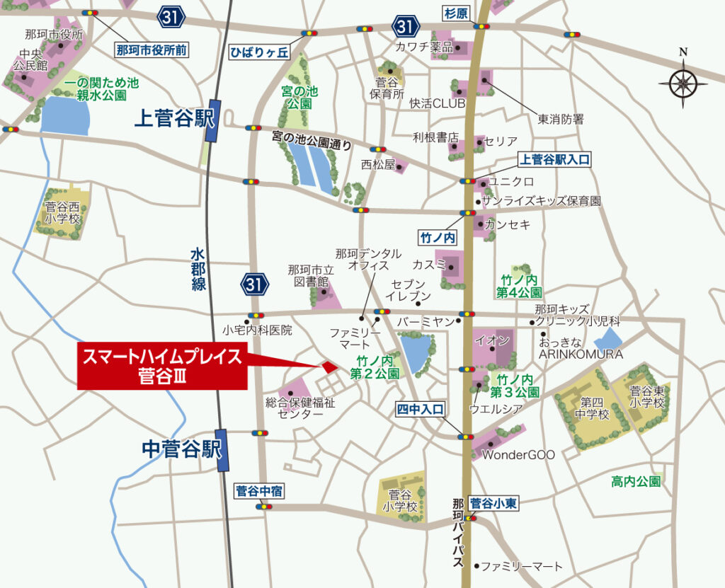 - JR水郡線「中菅谷」駅まで徒歩7分(約560m)