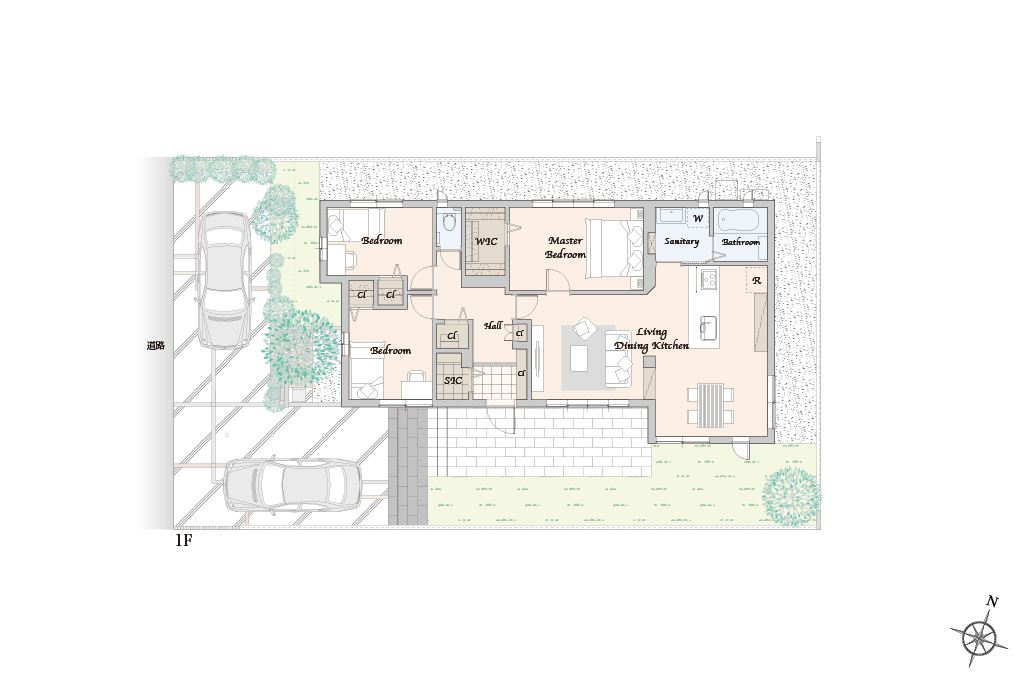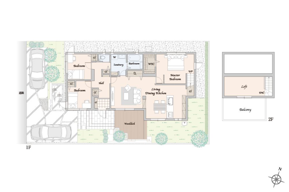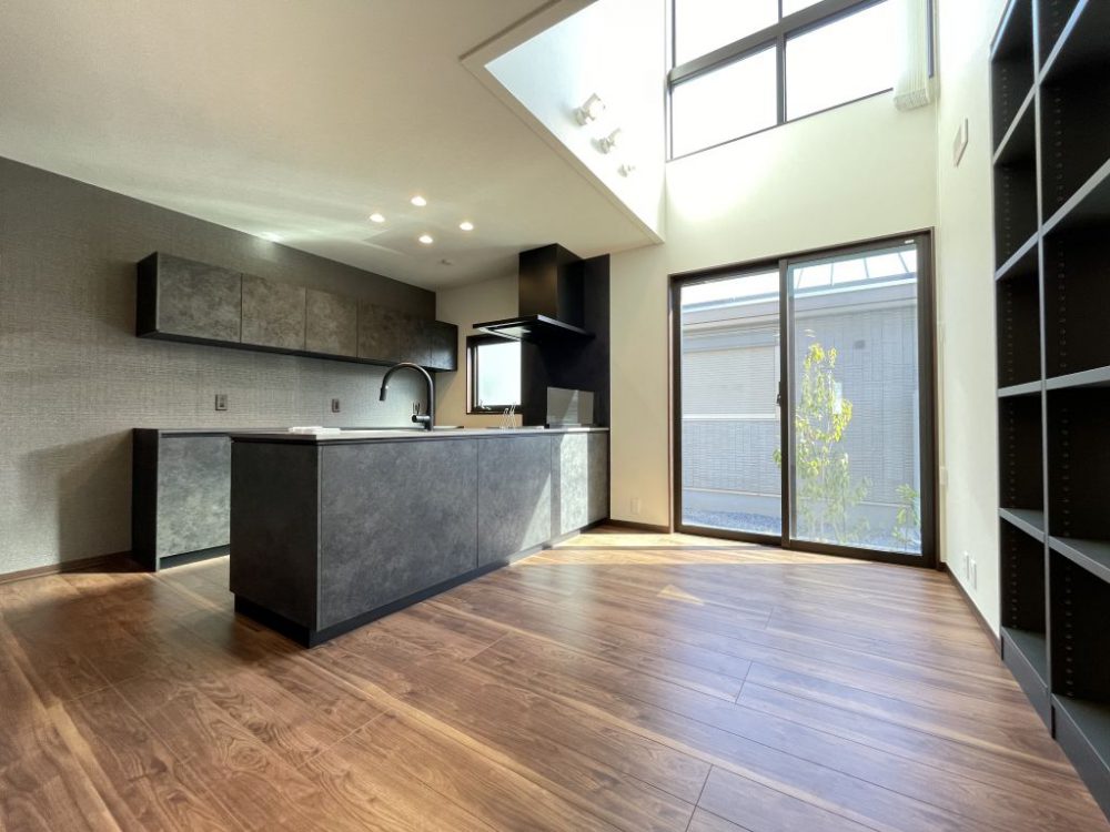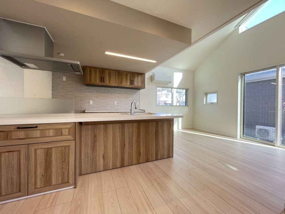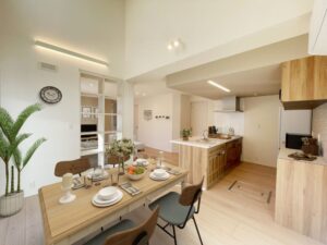 階段の上り下りがない為、足腰に負担の少ない生活ができます。視界が広がる傾斜天井のダイニングは開放感いっぱいです!水回りを集約したすっきり家事動線も魅力の一つです。