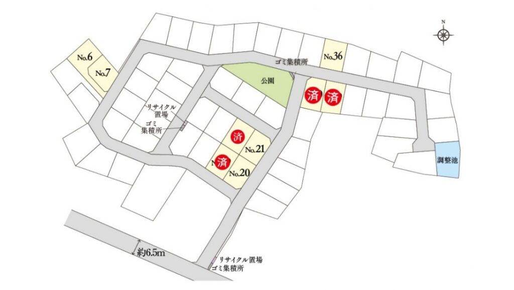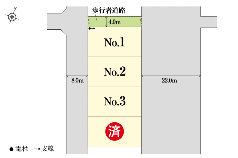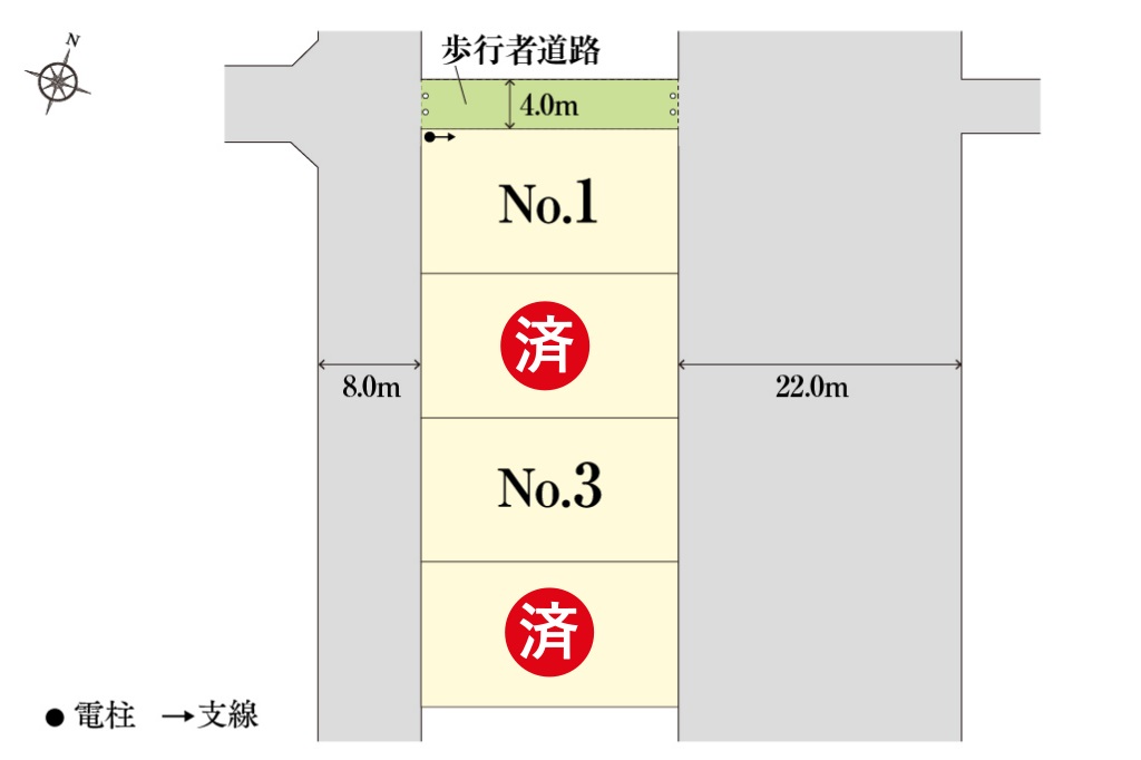 - 東側22.0m、西側8.0m、北側4.0m公道(アスファルト舗装)