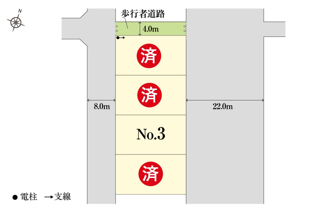 東側22.0m、西側8.0m、北側4.0m公道(アスファルト舗装)