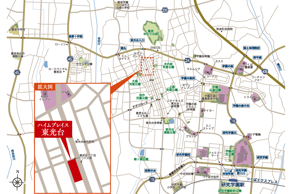 - 徒歩1分の「東光台二丁目」バス停からバス17分でつくばエクスプレス「研究学園」駅へ