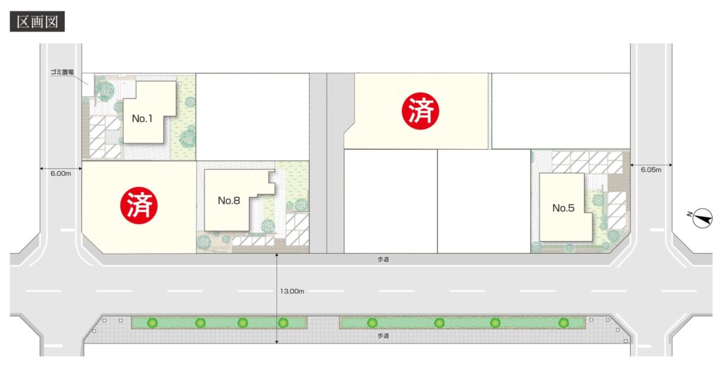 - 北側・南側各6.0m、西側13.0m公道(アスファルト舗装)
