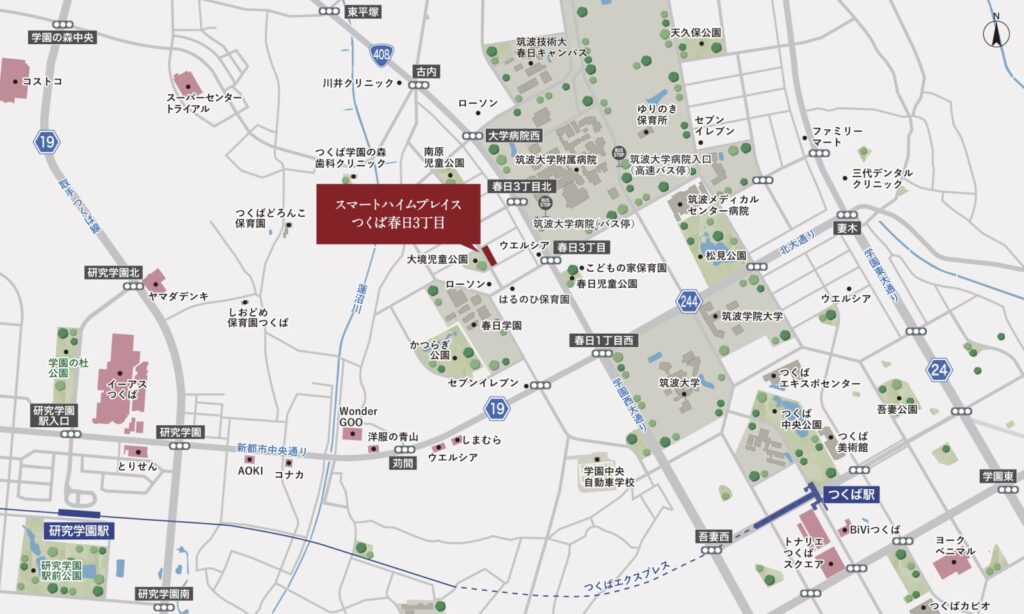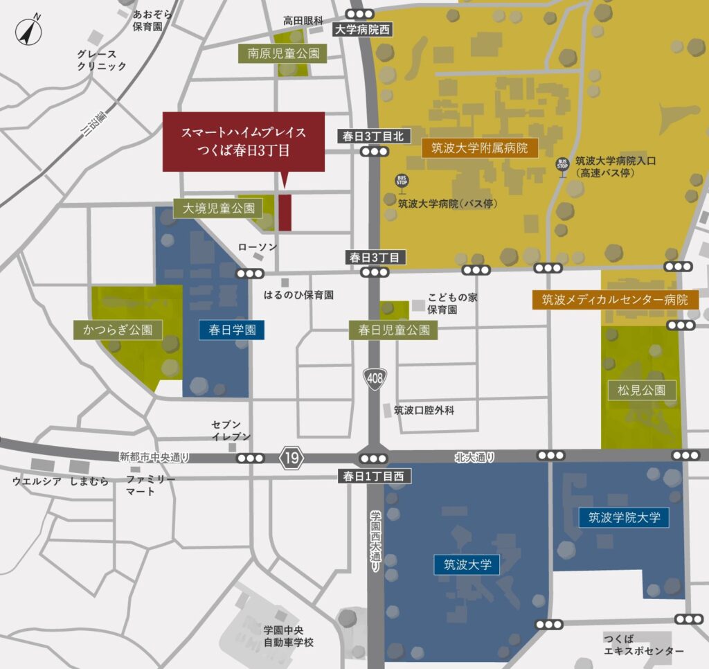 - つくばエクスプレス「つくば」駅までバス13分「筑波大学病院」バス停まで徒歩6分~7分